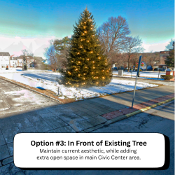 Maintain existing civic tree location allowing for event flow while adding extra open space. Keeps the tree more visible from the main road.