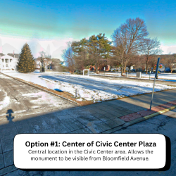 Central location in the town’s Civic Center. Perfect visual balance allowing the monument to be visible from Bloomfield Avenue. Better perspective with a lawn panel fronting Bloomfield Ave. Encourages visitors to walk into the park.