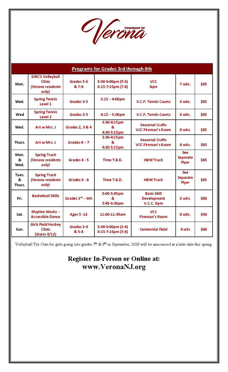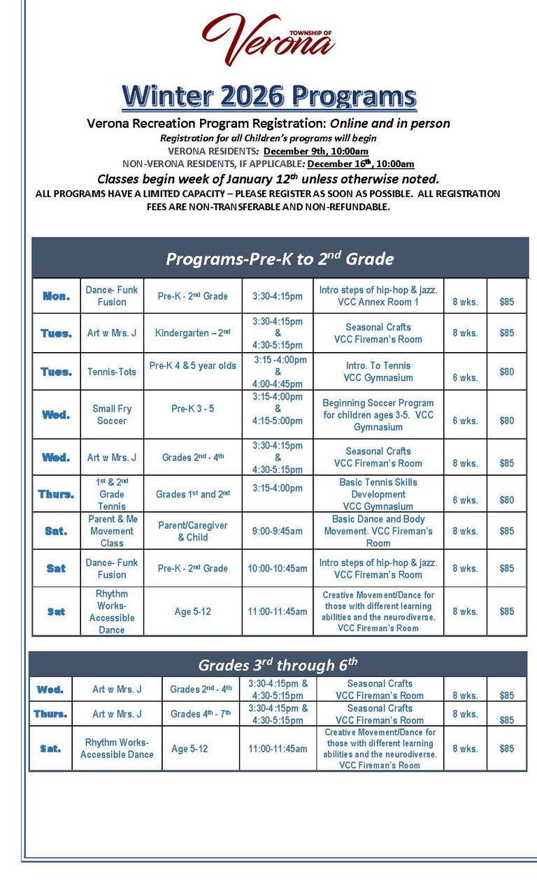 This provides a glance into the programs we offer. More detailed information will be provided via email through Community Pass as the programs open up each season. You can also reference our “Recreation Calendar” to see when registration dates open.