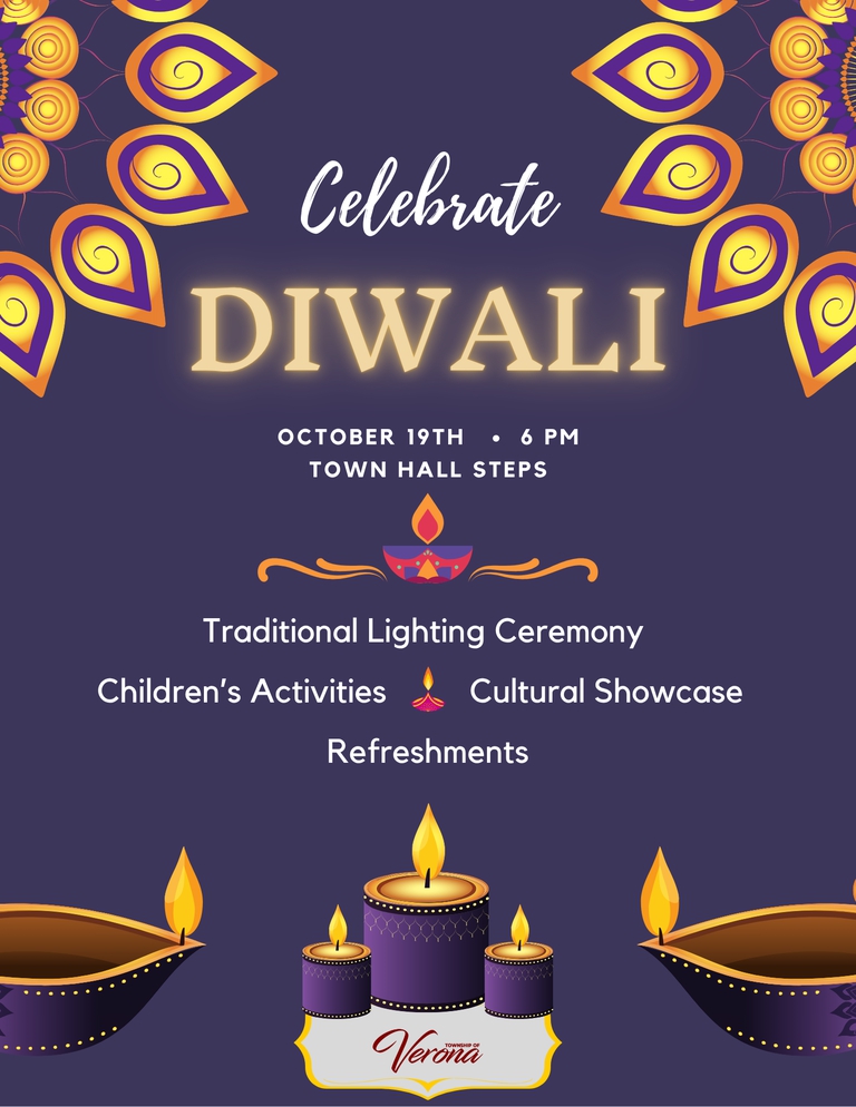 Celebrate Diwali and light up the night with Verona's Multicultural Inclusion and Accessibility Advisory Committee (MIAAC) on Sunday, October 19th at 6pm on Verona Town Hall Steps.